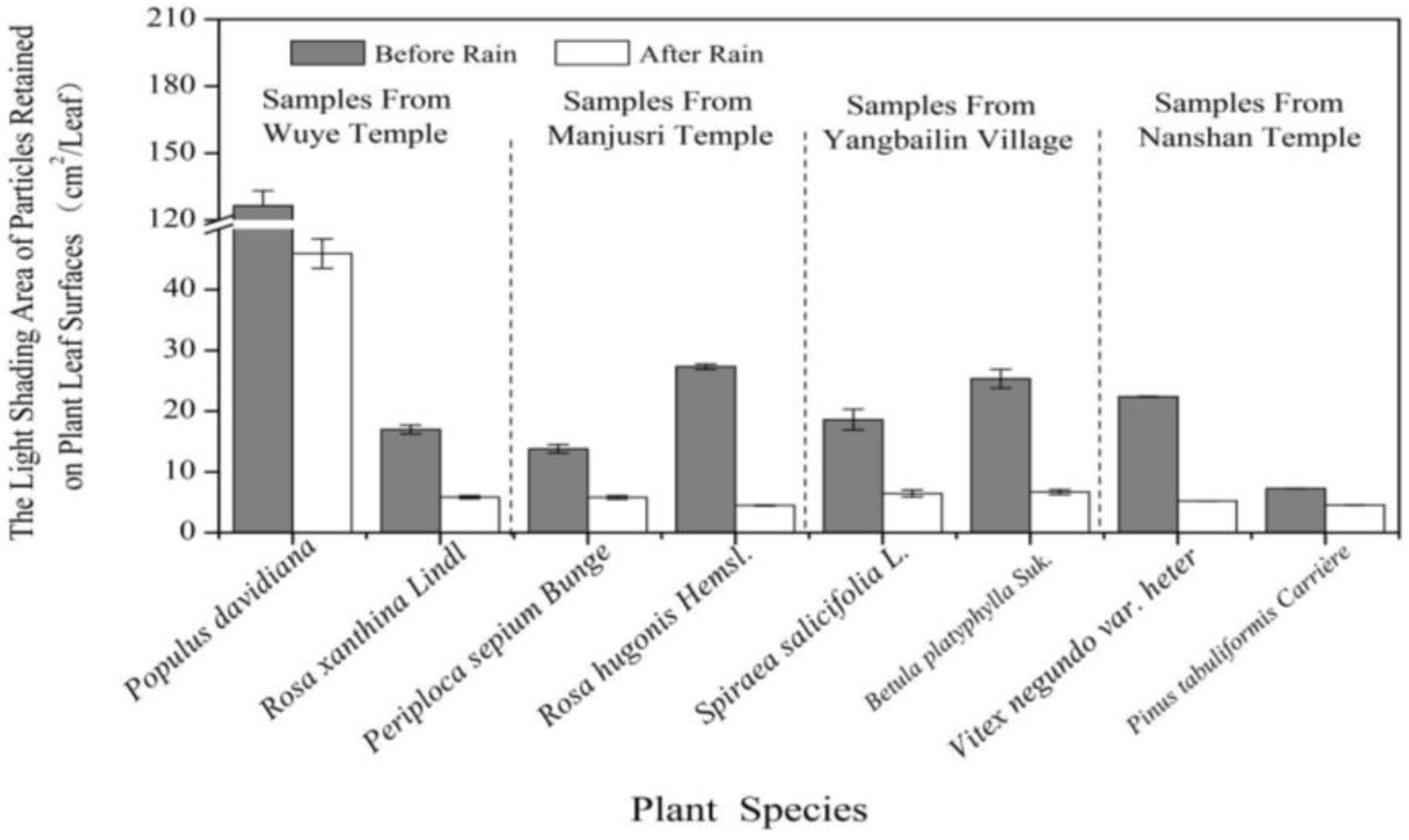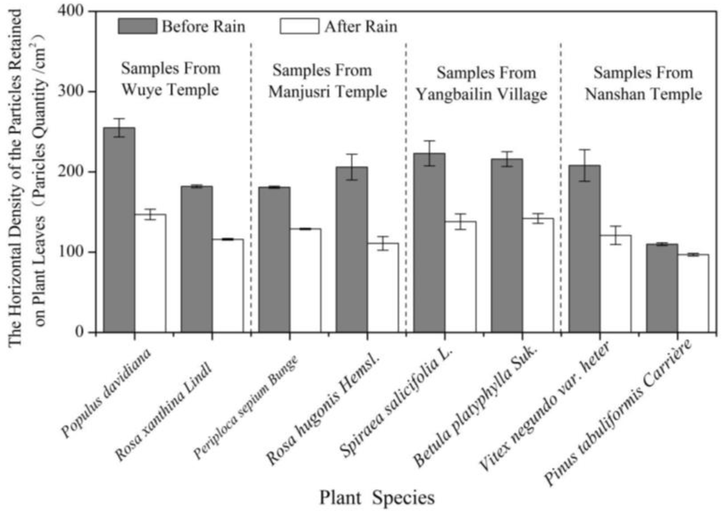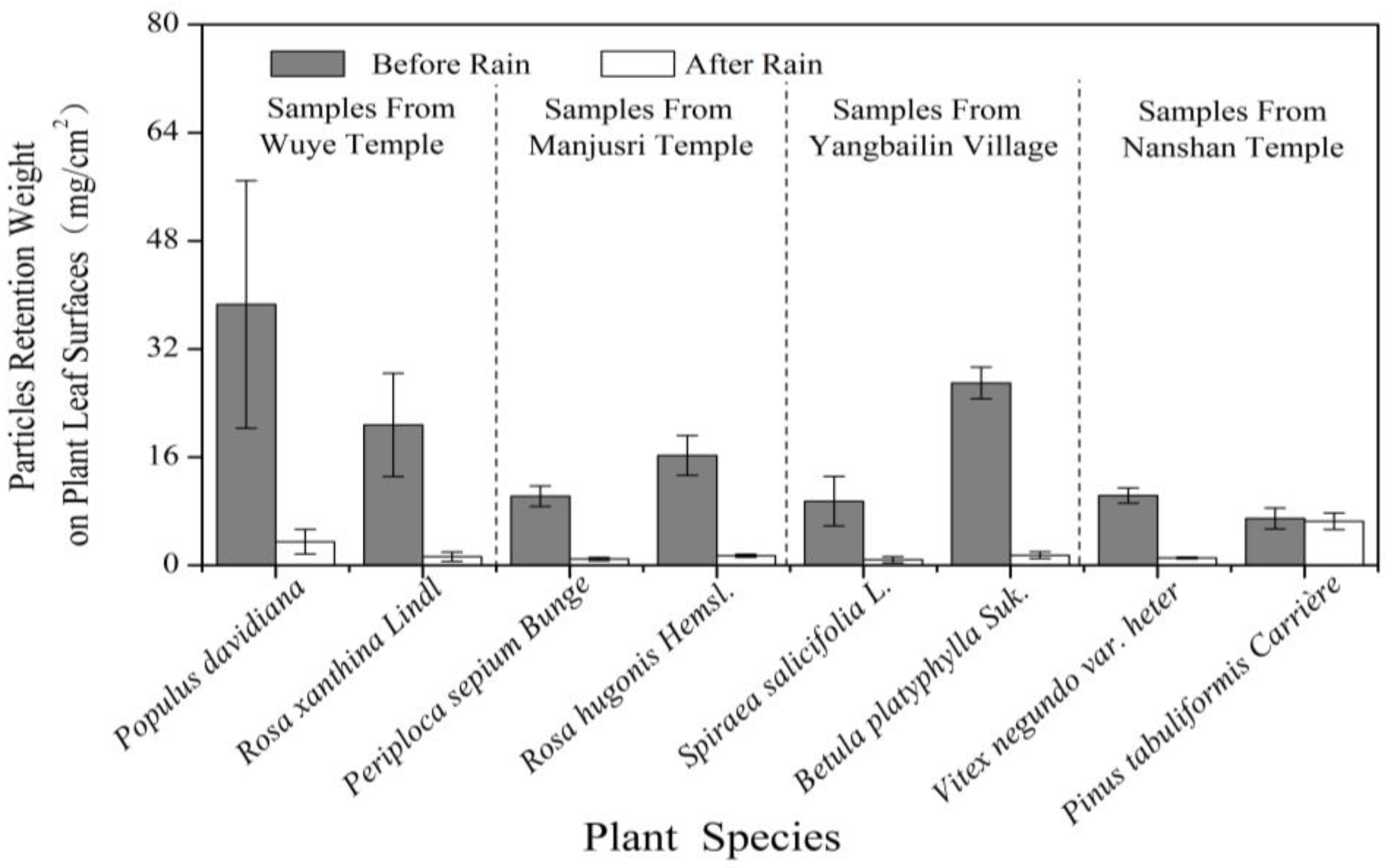 Shi, S.; Wu, Z.; Liu, F.; Fan, W. Retention of Atmospheric Particles by Local Plant Leaves in the Mount Wutai Scenic Area, China. Atmosphere 2016, 7, 104. https://doi.org/10.3390/atmos7080104