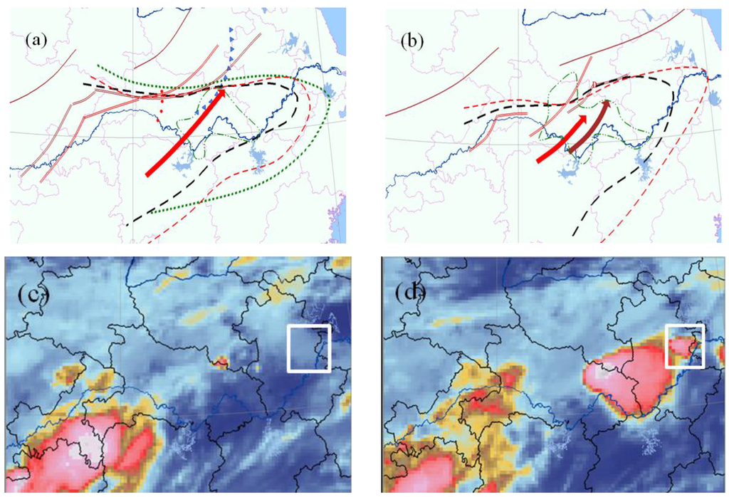Mesoscale analysis (a,b) and the analysis of satellite image characteristics (c,d) of 12 July 2012 rainstorm process in Wuhan: (a): 02:00; (b):08:00; (c): 07:00; and (d): 08:00 (red arrow: 850 hPa streamline; brown arrow: 700 hPa streamline; white square frame: the location of Wuhan).