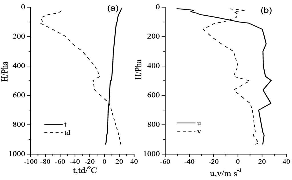 (a) Temperature and dew-point temperature and (b) environmental wind velocity profile observed at 08:00 LST on 12 July 2012 in Wuhan.