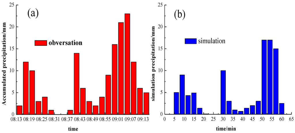 Ground rainfall accumlated in 3 min versus time: (a) observed durin 08:00–09:30 on 12 July 2012 in Wuhan; and (b) simulation.