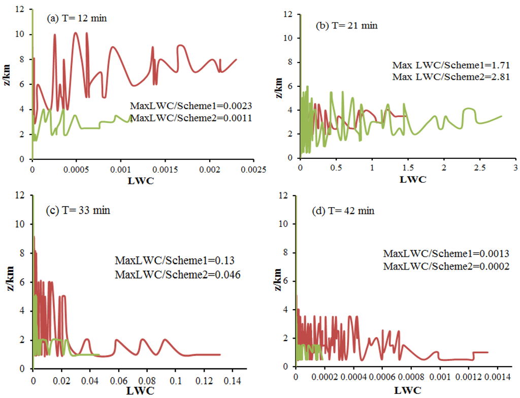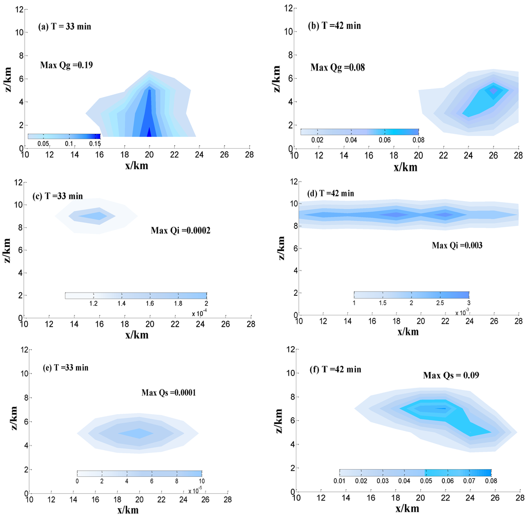 Ice crystal and snow particles occurred after 32 min, and the mean value of the graupel mixing ratio (), ice crystal mixing ratio () and snow mixing ratio () are described at 33 min and 42 min in Figure 8.