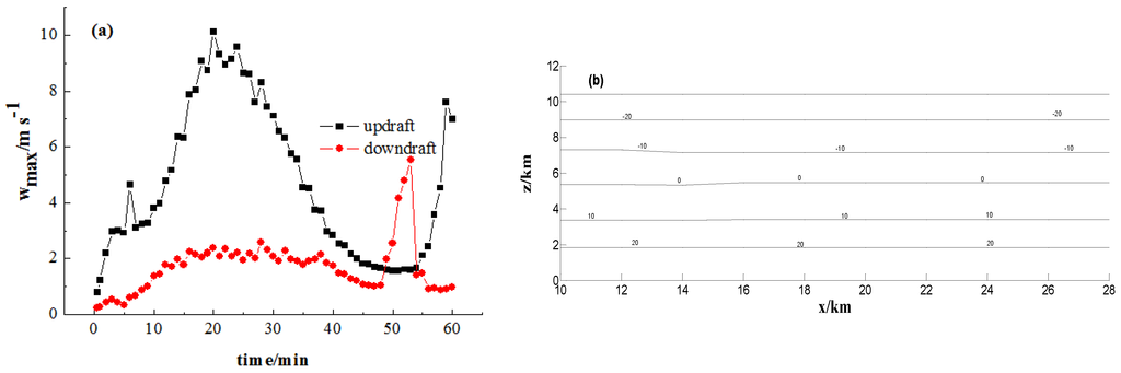 The maximum of updraft velocity and downdraft velocity with time (a) and the distribution of isotherms (b).