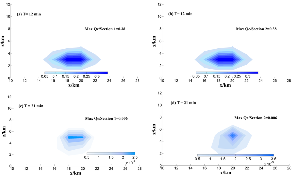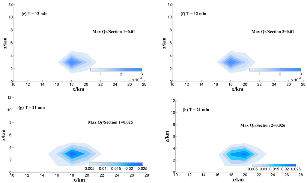 The mixing ratio of cloud droplets and raindrops are listed in Figure 7. The simulation results show that and have nearly the same peak value in Sections 1 and 2 at 12 min, because the massive ice particles are unprecedented before 21 min. Then, the center height of cloud droplets and rain mainly locates at z = 3.5 km, which corresponds to the isotherms of 0 °C (Figure 6 and Figure 7). Combined with the change of updraft and downdraft with time, the simulation results show that the updraft velocity has the peak value at 21 min with latent heat release in atmospheric environment. With the development of convection, more cloud droplets and rain drops are transported into the middle of cloud by updraft and the maximum updraft velocity is 10.8 m·s−1 at 21 min (Figure 6a). Although and have the same peak value in the Sections 1 and 2, the distribution range in the sections is different. The maximum of at 21 min is less than 12 min, because rain drops are increased by the auto conversion between cloud droplets and rain drops.