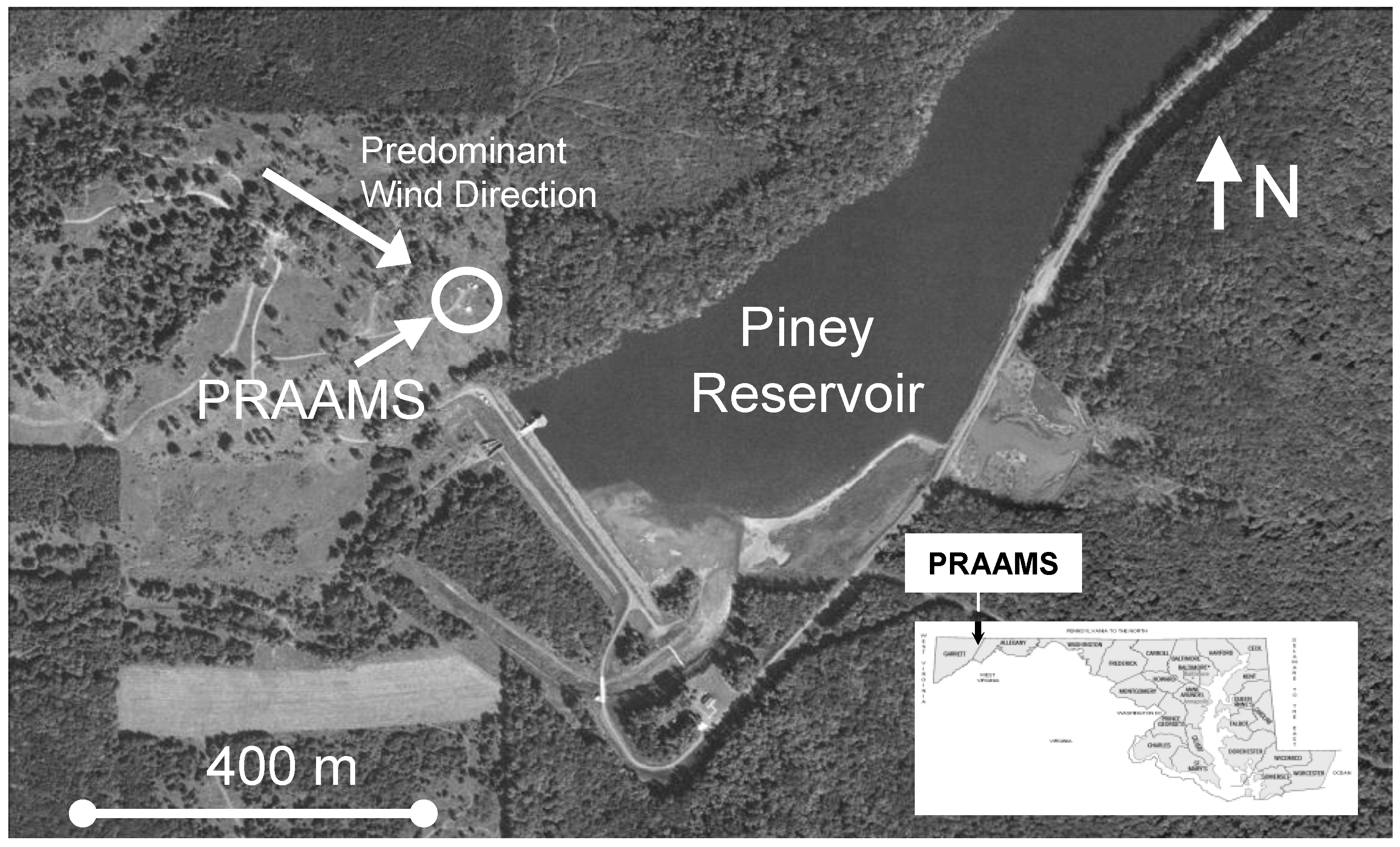 GEM fluxes were measured almost continuously from 6 July 2009 to 6 July 2010 at the Piney Reservoir ambient air monitoring station (PRAAMS) in Garrett County Maryland (39°42′21.29′′N, 79°0′43.21′′W). PRAAMS is located on a relatively flat, high elevation (781 m) ridge top adjacent to the Piney Creek Reservoir and is surrounded primarily by deciduous forests (Figure 1). In 2004, we cleared the ridge top, and we now measure a diverse suite of atmospheric trace gases, aerosols and meteorological parameters (Table 1). For this study, we also measured soil redox, soil temperature, soil moisture, leaf surface wetness, total UV, UV-B, net solar radiation, albedo, wind speed and wind direction. Our flux tower was located 30 m to the west of the equipment shelters (Figure 1). We chose this location in order to have the greatest amount of fetch (upwind distance of uniform roughness) from the west to north, which is the predominant wind direction. PRAAMS is also known as MD08, a monitoring station in the National Atmospheric Deposition Program’s National Trends Network (NADP NTN), NADP’s Mercury Deposition Network (NADP MDN) and the Atmospheric Mercury Network (AMNet). A detailed description of PRAAMS can be found in [18]. There are relatively few atmospheric mercury sources within 50 km of PRAAMS, but several sources within 150 km [19].