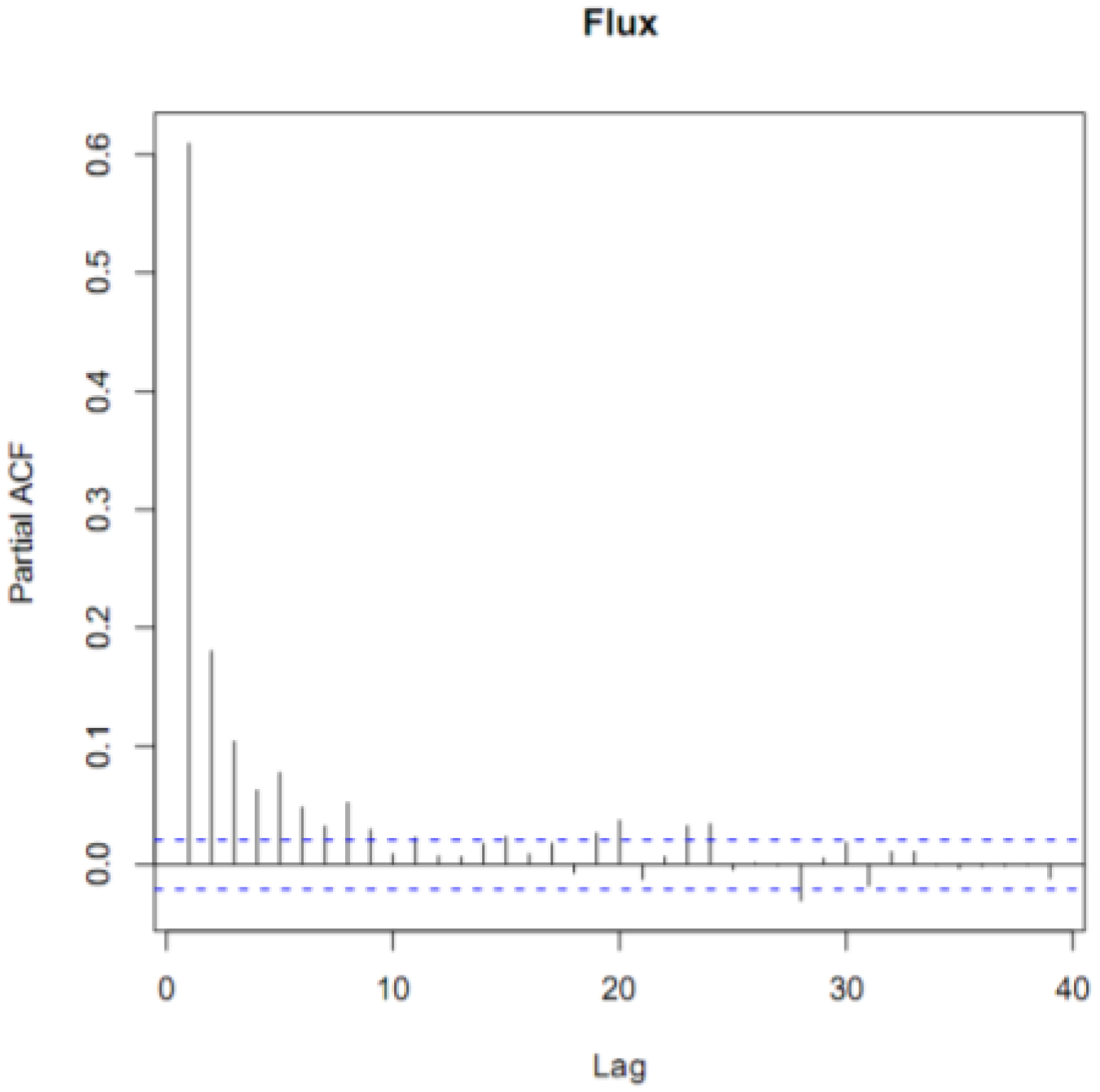 The partial autocorrelation function (ACF) diagram of hourly GEM fluxes for the entire campaign. The dotted lines indicate the 95% confidence interval above or below hours significantly correlated with hour zero. The time lag on the x-axis is in units of hours and the Partial ACF on the y-axis in units of percent (%).