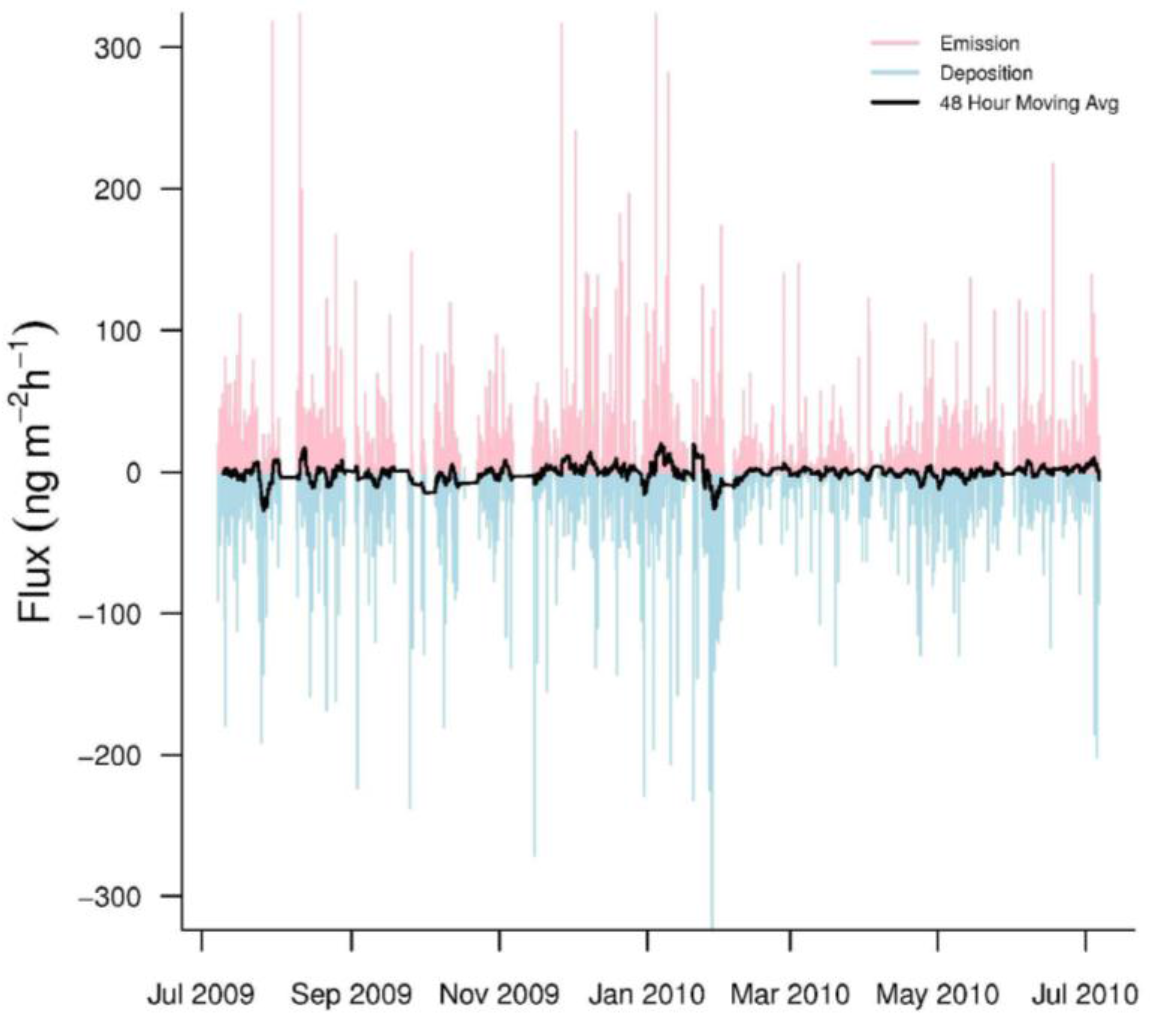 Surface-atmosphere exchange of GEM can be important to the overall biogeochemical cycling of mercury [1,2,3,4]. Studying this exchange is often difficult due to the relatively small concentration gradients, low surface-atmosphere fluxes, and rapid changes in the direction of the flux. GEM, which comprises up to 95% of total atmospheric gaseous mercury, can be emitted from and deposited to soils [3,5]. This bi-directional movement can happen quickly, with a site switching between being a source and a sink of GEM within a few hours [6,7]. This important flux has been measured with flux chambers and micrometeorological techniques. However, few studies have measured this flux for an entire year [4,7,8]. Due to the high variability of GEM fluxes, it is necessary to make long-term measurements in order to determine the factors controlling these fluxes, which may vary widely throughout the year [3].
