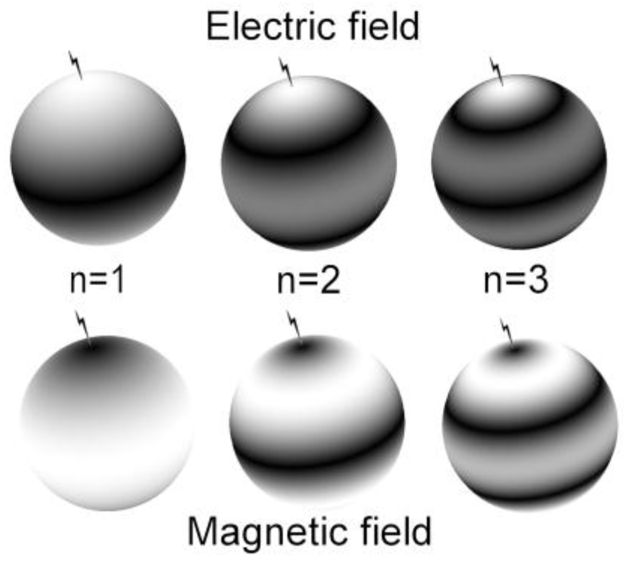 Electric and magnetic fields of the first three SR modes. White shading implies field maximum, while black shading implies field minimun.