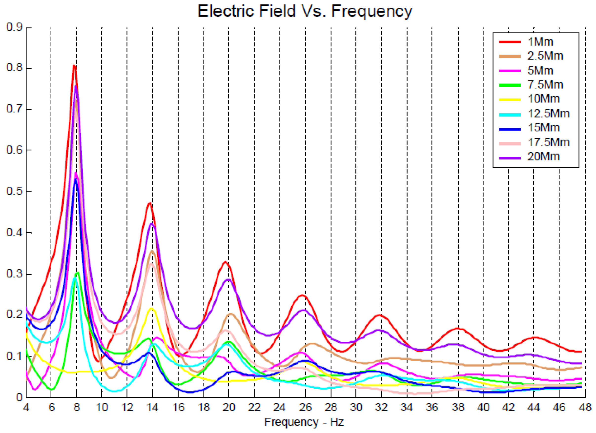 For other locations on the sphere, the relative intensity of the electric and magnetic fields depends uniquely on the source–observer distance (SOD). In Figure 2, the theoretical spectra for the vertical electric field, as a function of different SODs, are shown. These spectra are based on the solution of Equation (2) above, using an isotropic uniform cavity with standard conductivity profile and current source. At a distance of 10 Mm from the source lightning (yellow curve), the electric field shows a minimum intensity at 8 and 20 Hz (n = 1, 3) while a maximum occurs at 14 and 26 Hz (n = 2, 4). Every distance has a specific spectral pattern in both the electric and magnetic fields, a characteristic often used in SR geolocation of intense lightning flashes using a single station [28,29,36,37,38,39,40].