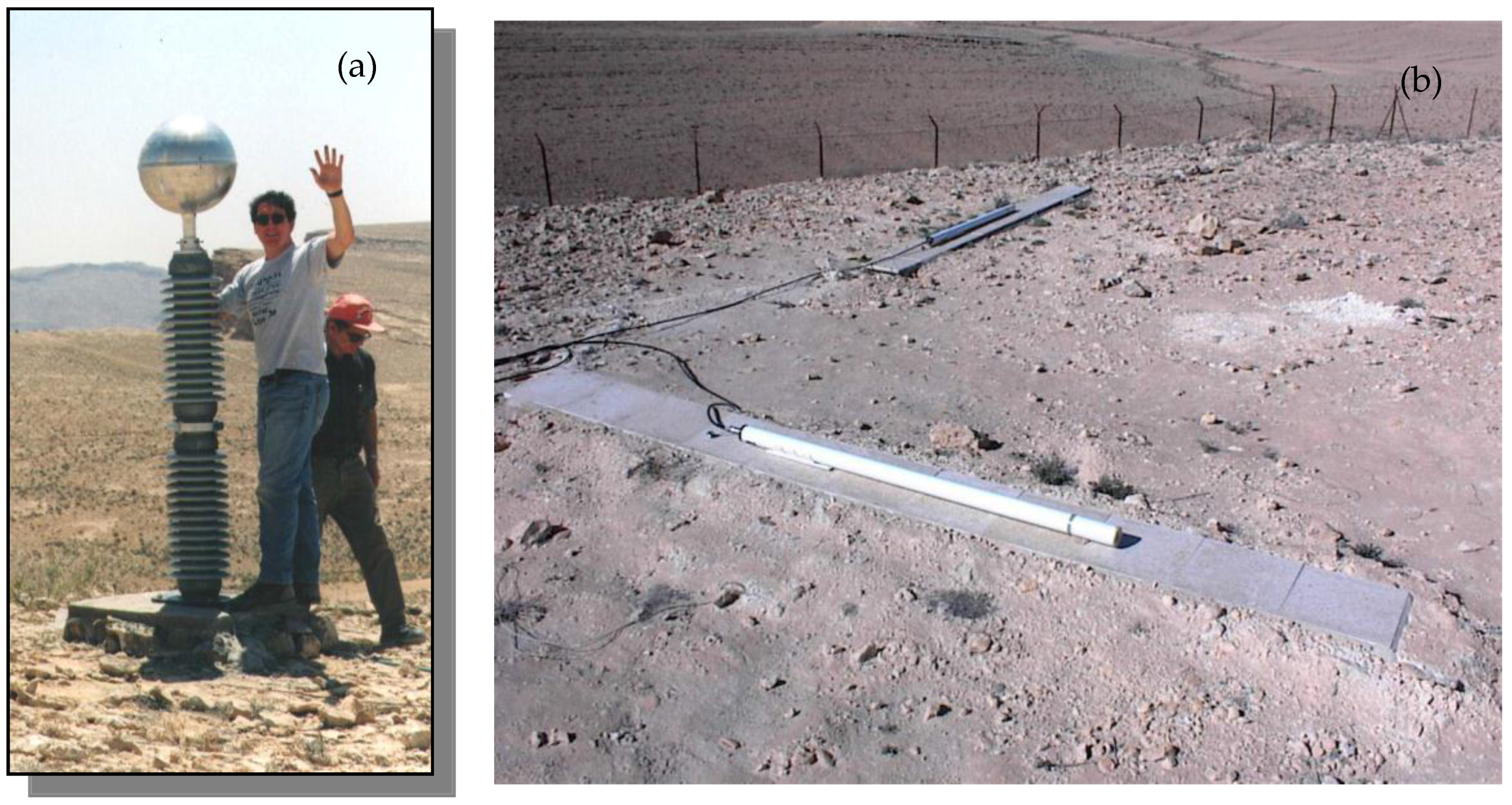 (a) Vertical electric field ball antenna with author; and (b) two horizontal induction coils at the Mitzpe Ramon, Israel SR site.