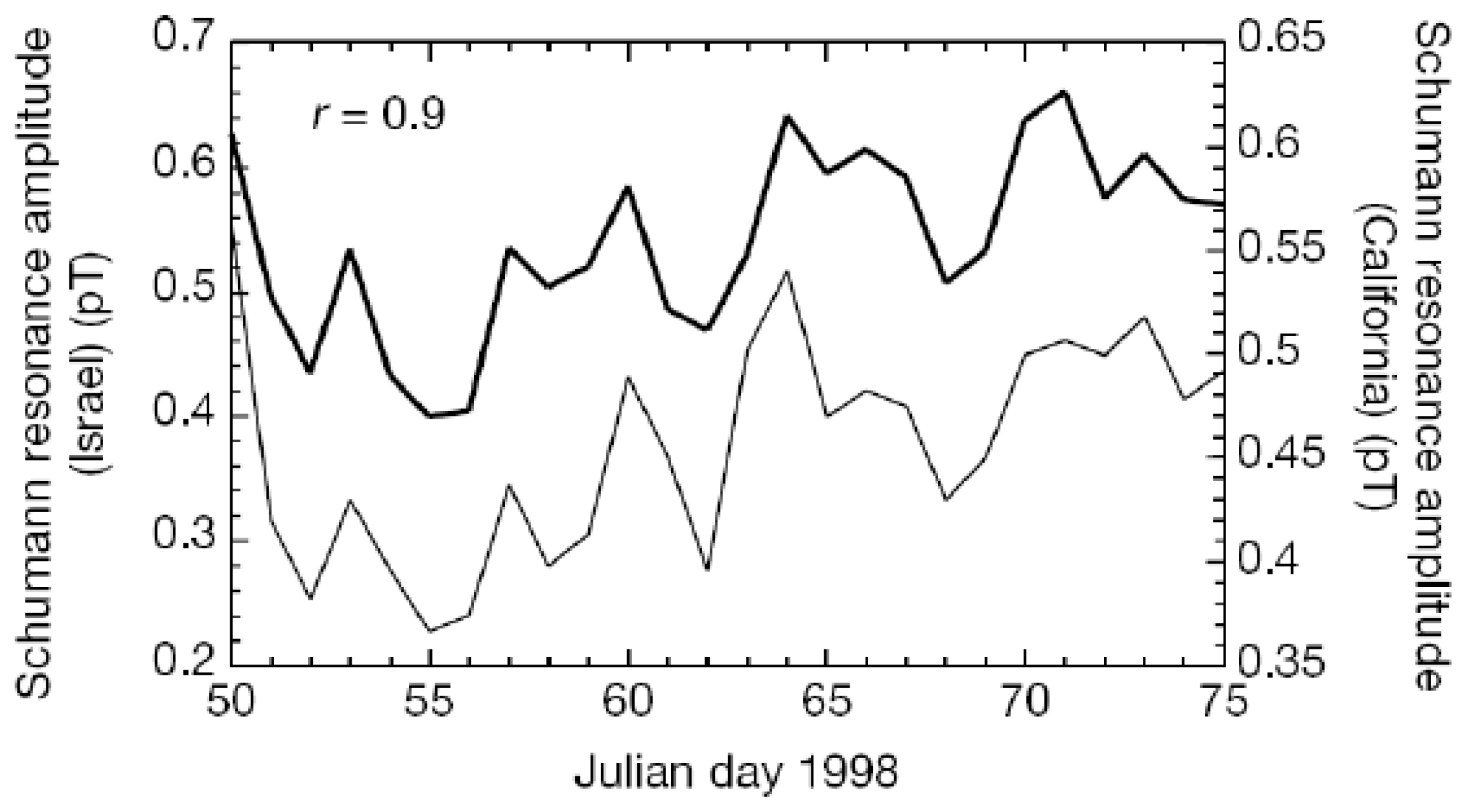 Comparison of the SR amplitude of the first mode (8 Hz) measured simultaneously in Israel and California [87].