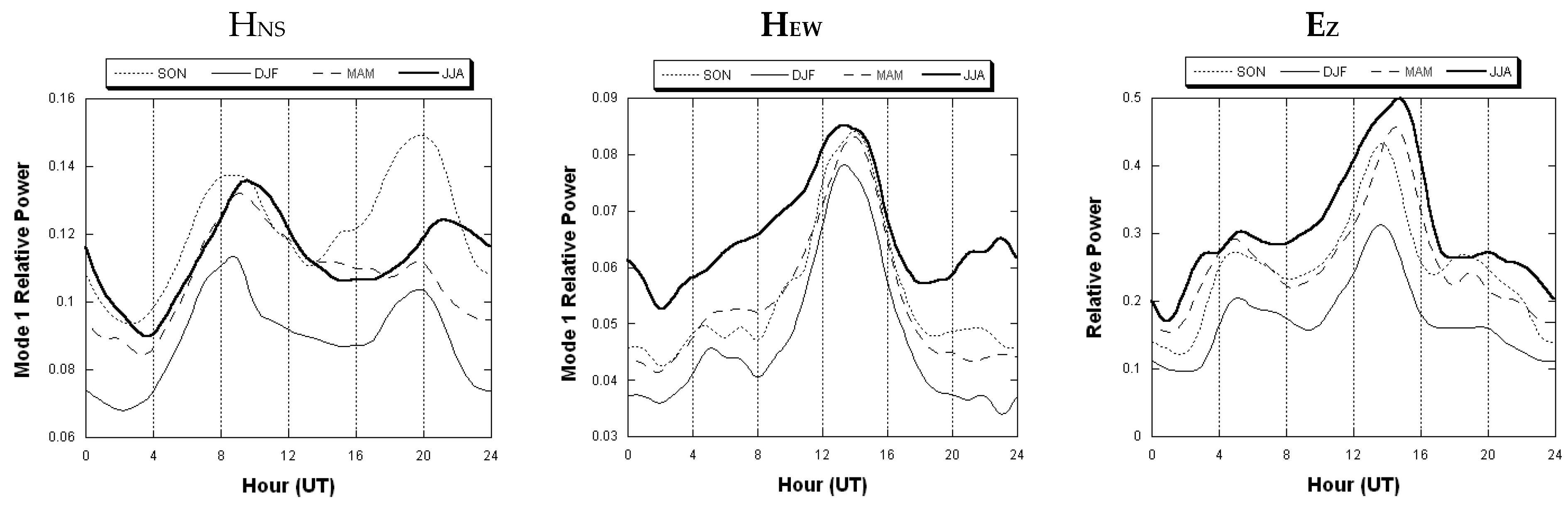The four-year mean diurnal and seasonal variations of the SR power for the first mode—individual electromagnetic components of the SR field [56]. SON = September, October, and November; DJF = December, January, and February; MAM = March, April, and May; JJA = June, July, and August.