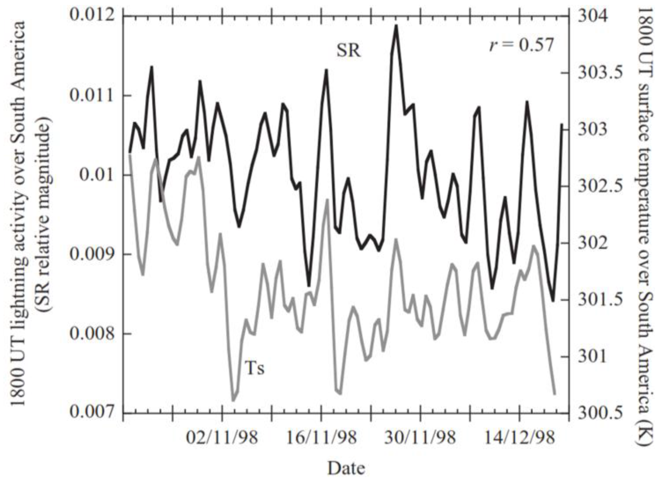 Williams [26] suggested that global temperatures may be monitored via the SR. The link between Schumann resonance and temperature is lightning flash rate, which increases nonlinearly with temperature [25,26,96,97,98]. The nonlinearity of the lightning-to-temperature relation provides a natural amplifier of the subtle (several tenths of 1 °C [99]) temperature changes and makes Schumann resonance a sensitive “thermometer”. SR data sets also show strong positive correlations between surface temperatures and SR power on seasonal and daily timescales [100]. Figure 8 presents an example of daily South American lightning activity derived from observations of the 8 Hz magnetic field recorded in Israel, and surface temperatures integrated over South America. The surface temperatures were obtained from the National Center for Environmental Prediction (NCEP) reanalysis data set [101] integrated over the South American continent. Although the correlation coefficient is only 0.57, it is clear that on warmer days there is more lightning activity than on cooler days.