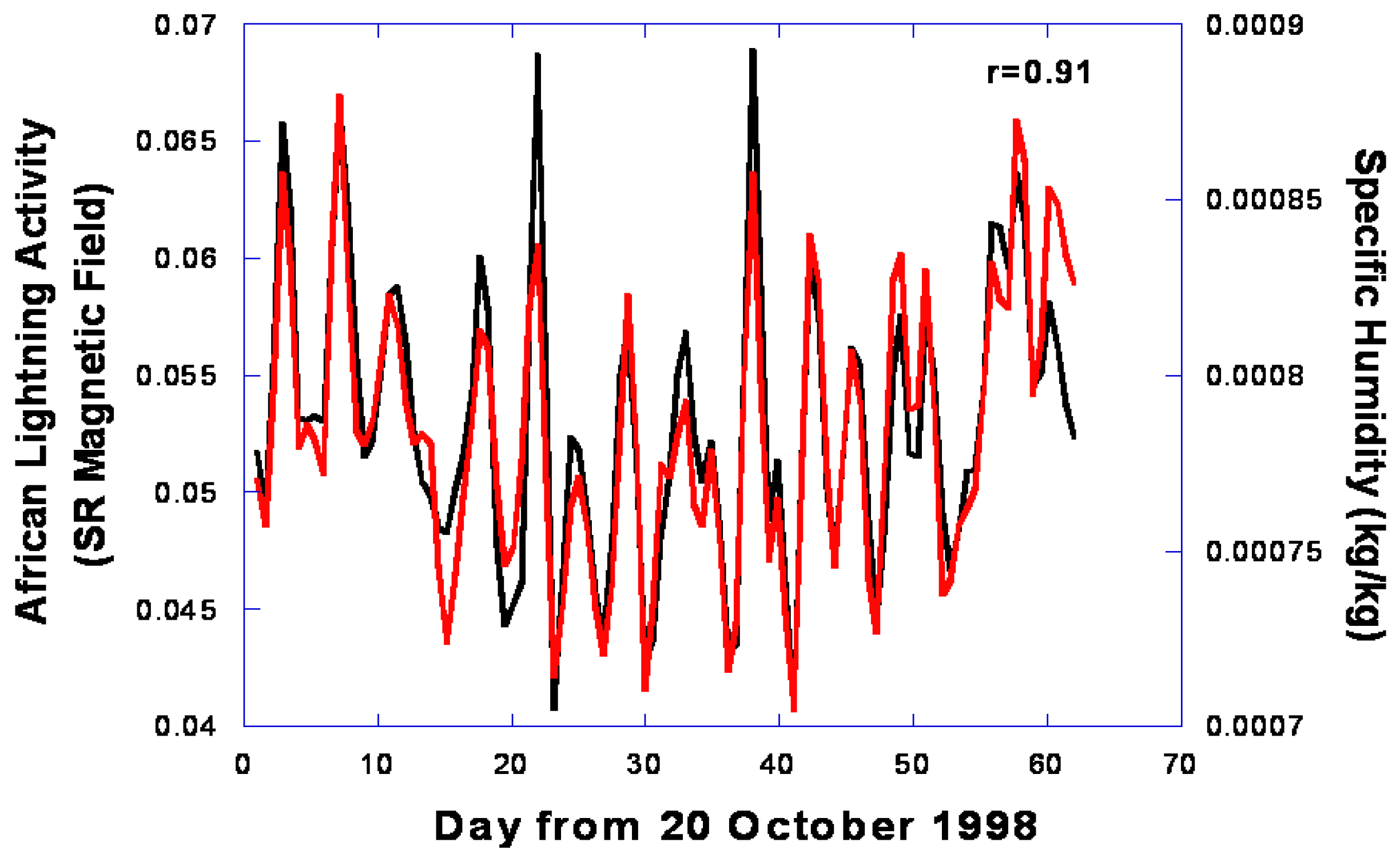 Daily SR 8 Hz magnetic field (at 14 UT Hew) records (black) and upper tropospheric water vapor (red) over tropical Africa [100].