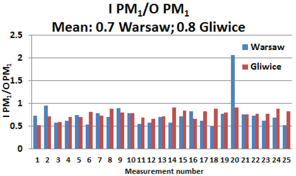 Both in Gliwice and Warsaw (except for one day in Warsaw), the I/O ratio for 24-h PM1 concentrations did not exceed 1 (Figure 2). In Gliwice, its mean value was 0.8 and ranged from 0.5 to 0.9. In Warsaw, the mean value was similar to the mean value in Gliwice (0.7) and ranged from 0.5 to 2.1. Stronger I/O value fluctuations occurred in Warsaw.