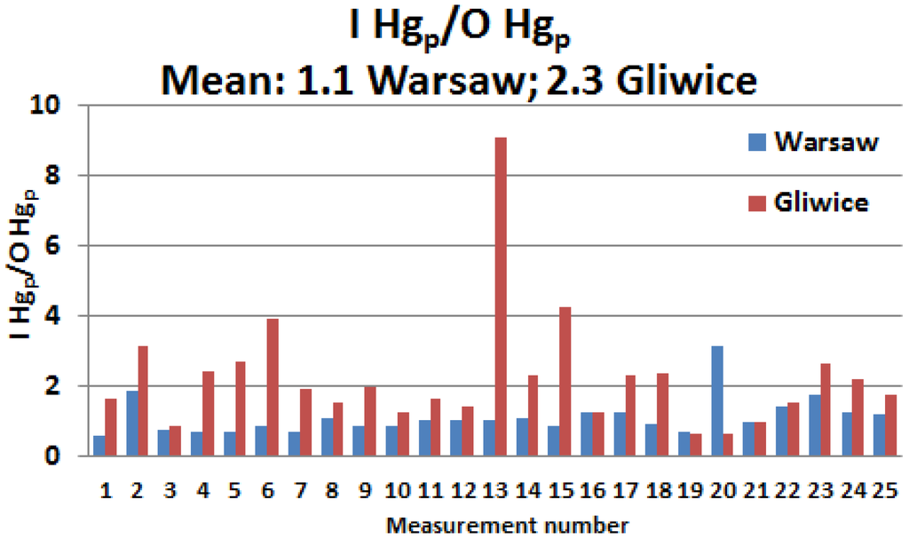 The I/O ratios of the 24-h concentrations of Hgp in both cities are presented in Figure 3. In Warsaw, half of the 24-h I/O values yielded a result slightly lower than 1. In Gliwice, the ratio was high (only in three cases was it less than 1) and the maximum and mean I/O values there were 9.1 and 2.3, respectively. In Warsaw, the highest I/O value slightly exceeded 3, while the mean ratio was 1.1.
