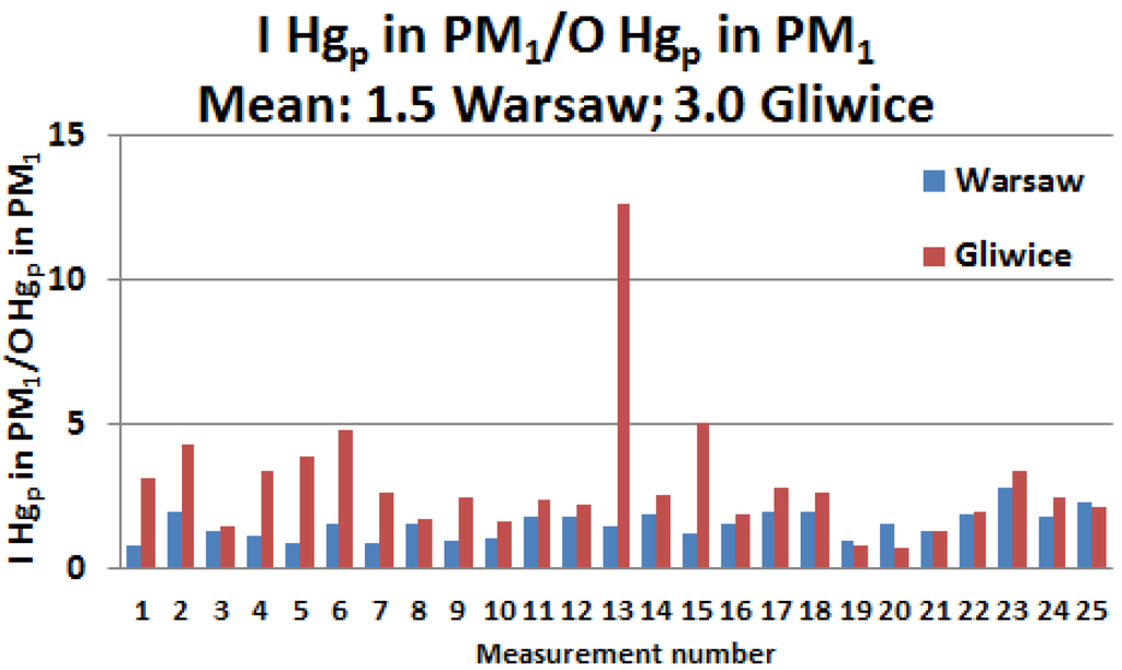 The ambient concentrations of PM1 and Hgp and the Hgp content in PM1 were considerably higher in Gliwice than in Warsaw. This applied to the values obtained both outdoors and inside the teaching rooms. The Mann–Whitney and Wilcoxon tests (SPSS) confirmed a statistical significance of the differences between the mean values for both PM1 and Hgp ambient concentrations and for the Hgp content in PM1 in Gliwice and Warsaw (αassump. = 0.05, pcomp. < 0.0002).