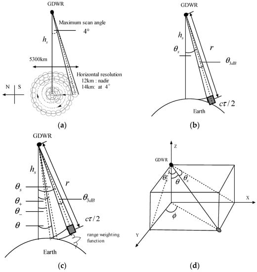 The GSWR was designed to work in geostationary orbit at an altitude of 36,000 km and operate at a frequency of 35 GHz. A deployable, 35 m spherical antenna reflector together with two antenna feeds were used to perform spiral scans from nadir to 4° to cover a 5300-km circular disk on the Earth’s surface [,]. The geometry of the spiral scan pattern of the GSWR is shown in Figure 1a, with a beamwidth of 0.019°, the corresponding horizontal resolution of the GSWR ranges from 12 km at nadir to 14 km at 4° scan. As shown in Figure 1b,c, surface clutter echoes from the antenna main lobe, sidelobe, and range sidelobe are received simultaneously by the radar receiver with rain echoes, which will prevent exact measurement of the rain echoes.