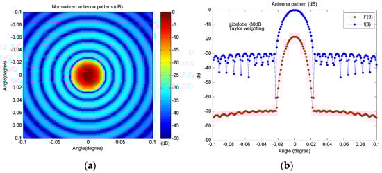 ,  are separately the antenna beamwidth along the direction in coordinate plane of X-Z and Y-Z, which are designed for the same beamwidth of 0.02°. The sidelobe of the antenna pattern function based on Equation (11) above is only −13 dB, so this pattern function is then weighted through Taylor window to decrease the sidelobe. This final normalized antenna pattern in one- and two-dimensions is shown in Figure 2. The sidelobe of the antenna is designed to −30 dB which is close to the requirements of the GSWR concept design.