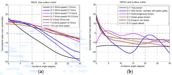 Normalized radar cross-section of sea and land surface clutter under different incidence angles; (a) sea surface clutter; G.Y, S.H, T.D separately show the NRCS data from Grant and Yaplee [], Satake and Hanado [], and Tanelli and Durden []; (b) land surface clutter.
