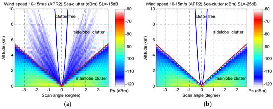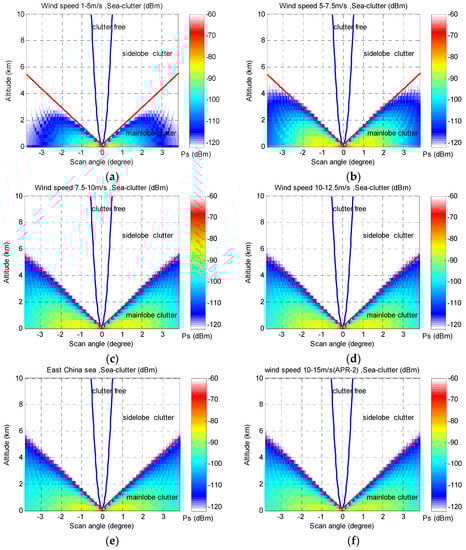 The powers of different sea surface and land surface clutter are separately shown in Figure 4 and Figure 5. In these figures, the x-axis indicates the spiral-scan angles from nadir to the maximum scan angle of 4°, while the y-axis is the altitude which is decided by the radar range and the incident angles of the radar beam. The red and blue lines in the figures show the region borders of the antenna mainlobe clutter, sidelobe clutter, and clutter free area, which can directly indicate what factors they are caused by. The methods of border calculation are the ones used by Tetsuya Tagawa [] and the width of the mainlobe is set to two times of beamwidth, which can be seen in Figure 2b. In addition, only those power values greater than the radar minimum sensitivity are presented in color because those less than the radar minimum sensitivity are thought not to be detected by the radar receiver.