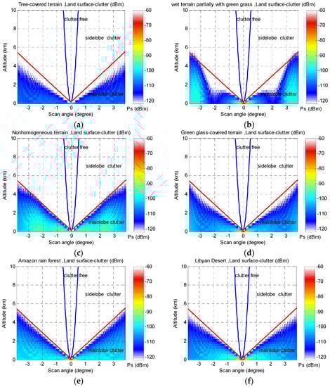 Figure 5 has shown the land surface clutter distribution under six kinds of land terrains. As shown in Figure 5b,d–f, the powers of land clutter in the scan angles near nadir are still very strong, which are similar with those of sea clutter. This is because the NRCS values near nadir in these four types of land terrain are large. However, the whole situation of land surface clutter interference at larger scan angles seem to be less serious than those of sea surface clutter interference, which is mostly because the NRCS of the land surface is much smaller. The whole variation tendency of clutter regions under different scan angles is similar to those of sea surface clutter, but the clutter powers are much less.