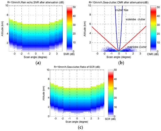 The power ratio of the rain echo signal to noise (SNR), the power ratio of clutter signal to noise (CNR) after rain attenuation, and the power ratio of the rain echo signal to clutter signal (SCR). A uniform stratiform rain layer is assumed with the rain top of 6 km; (a) SNR of rain intensity at 10 mm/h; (b) CNR of the sea surface; and (c) SCR of the sea surface greater than 0 dB.