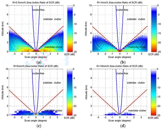 Figure 7 shows the SCR results between the sea surface clutter and four types of different rain intensity. Only those SCR results below 0 dB are shown in these figures, which can directly indicate the scan angles and the height interfered by surface clutter in GSWR. Results indicate that the regions of surface clutter interference are wide when the rain intensity is 1 mm/h or less. As the rain intensity increases to 5 mm/h, the rain echoes are mainly interfered by the antenna mainlobe. The maximum interfered angles are centralized on 1° to 2° and its interfered height is close to 1.5 km. However, when the rain intensity increases to 10 mm/h or greater, the rain echoes, except those at nadir, are slightly affected by sea surface clutter due to significant rain attenuation. Certainly, the rain echoes near the sea surface are also attenuated significantly.