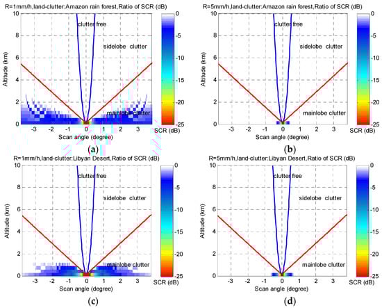 Power ratio of rain echo signal to land surface clutter (SCR), with land terrain of Amazon rainforest and Libyan Desert. (a) SCR: 1 mm/h, Amazon rain forest; (b) 5 mm/h, Amazon rain forest; (c) SCR: 1 mm/h, Libyan desert; and (d) 5 mm/h, Libyan desert.