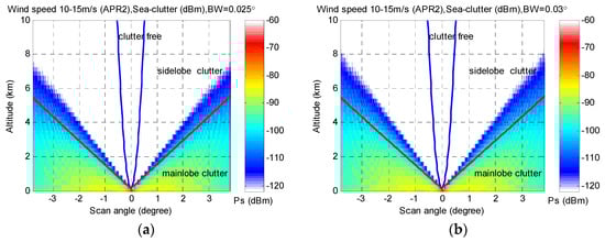 Figure 9 has given the clutter power distribution of the sea surface with a wind speed of 10–15 m/s from two different antenna beamwidth, where the antenna sidelobe is −30 dB. Figure 4f shows the similar clutter power distribution with the antenna beamwidth of 0.02°. As shown in these three figures, we can see that the antenna beamwidth will affect the height and the power of clutter interference. The height of clutter interference will be gradually higher with the increase in the antenna beamwidth. When the beamwidth changes from 0.02° to 0.03°, the height of clutter interference close to the maximum scan angles has increased 2 km. The reason is that the cross intersectional area between the antenna beam and the Earth’s surface increased with a wider beamwidth, which finally decided the height of clutter interference. However, the power of these increased clutters is weaker than –100 dBm. In addition, the whole powers of clutter in the larger beamwidth will decrease slightly. When the antenna beamwidth changes from 0.02° to 0.03°, the power of clutter close to sea surface will reduce from 2 dB to 5 dB. This is because the wider beamwidth means the smaller size and the lower gain of the antenna. Obviously, if rain attenuation is considered, especially when the rain intensity is greater than 5 mm/h, the extension of clutter interference will not be affected by changing the beamwidth from 0.02° to 0.03°.