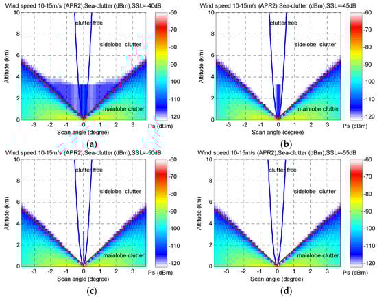 Figure 11 has shown the clutter power distribution of a middle-intensity sea surface from four different range sidelobes. From the figures we can see that the powers of sea surface clutter from the range sidelobes are proportional to those from the antenna mainlobe and sidelobe, but the power of this clutter from the range sidelobe are obviously much weaker. With a range sidelobe of −40 dB, the height of clutter interference within the scan angle of 1° increased obviously, which can be up to 3.5 km. As shown in Figure 11d, when the range sidelobe reduces to −55 dB, the clutter powers from the range sidelobe near the surface shrink. If considering the rain attenuation, the clutter from the range sidelobe will be completely attenuated by rain echoes when the rain intensity is greater than 5 mm/h. In brief, the clutters from range sidelobes are weaker than those from the antenna mainlobe and sidelobe. The performance of range sidelobes with −55 dB can meet the need of design from the view of clutter suppression.