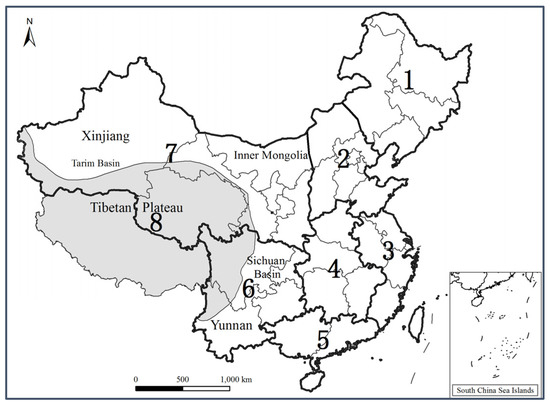 Division of Chinese territory into administrative regions. Zones 1–8 represent Northeast China (NEC), North China (NC), East China (EC), Central China (CC), South China (SC), Southwest China (SWC), Northwest China (NWC), and the Tibetan Plateau (TP), respectively. Zone 8 overlaps with Zones 6 and 7.