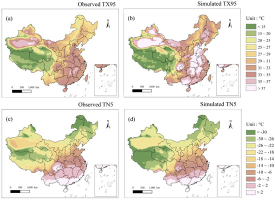Distribution of the TX95 and TN5 under observation and simulation in baseline period: (a) observed TX95; (b) simulated TX95; (c) observed TN5; and (d) simulated TN5. Unit: °C.