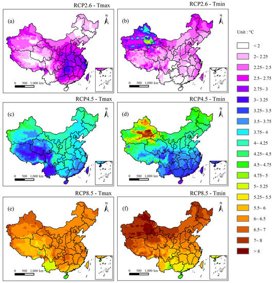 Changes of the maximum (left) and minimum (right) temperatures compared with the baseline period levels under the RCP2.6, RCP4.5 and RCP8.5 scenarios by the end of the 21st century: (a) changes in maximum temperature under the RCP2.6 scenario; (b) changes in minimum temperature under the RCP2.6 scenario; (c) changes in maximum temperature under the RCP4.5 scenario; (d) changes in minimum temperature under the RCP4.5 scenario; (e) changes in maximum temperature under the RCP8.5 scenario; and (f) changes in minimum temperature under the RCP8.5 scenario.