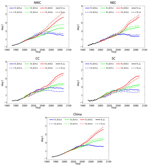 Figure 5 shows that, relative to the 1961–1990 reference period, there is a general increase in the annual Tmax and Tmin over China’s land in the 21st century. The increase in TN5 is greater than that in the TX95 for all three RCP scenarios. The maximum temperature would increase by 2.4–6.2 °C while the minimum would increase by 2.4–6.7 °C compared to the baseline period. However, the Chinese territory presents a huge and diverse panel of climate types, and different regions may respond differently under future climate change. Interestingly, the eight sub-regions can be divided into two categories according to their regional differences in the warming rates between the Tmax and Tmin. The first type, including NWC, NEC, NC and TP, are mainly located in the high-latitude and high-elevation area of China, which is characterized by larger warming in the Tmin than in the Tmax under all of the RCP scenarios in the projected period. The asymmetry of the warming magnitudes between Tmax and Tmin is larger under higher-emission scenarios, in the order of RCP8.5, RCP4.5 and RCP2.6. NWC and NEC are typical regions, as shown in Figure 5. By the end of the 21st century, the differences in the warming magnitude (Tmin-Tmax) in NWC are 0.4 °C, 0.8 °C and 1.1 °C, respectively, under the RCP2.6, RCP4.5 and RCP8.5 scenarios. The higher warming rate in Tmin in these regions might be due to the reduction in the snow and ice cover under climate warming and that the increased water vapor content in a warmer atmosphere can obstruct the occurrence of extreme low temperatures in the high-latitude and high-elevation areas [4].