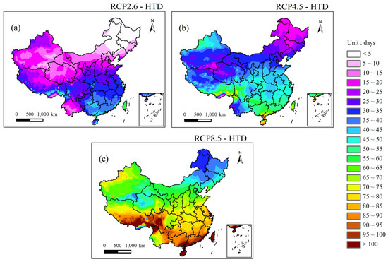 Changes of the HTD by the end of the 21st century compared to the baseline level under RCP2.6, RCP4.5 and RCP8.5 scenarios: (a) changes in HTD under RCP2.6 scenario; (b) changes in HTD under RCP4.5 scenario; and (c) changes in HTD under RCP8.5 scenario. Unit: days.