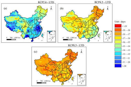 Changes of the LTD by the end of the 21st century compared to the baseline level under RCP2.6, RCP4.5 and RCP8.5 scenarios: (a) changes in LTD under RCP2.6 scenario; (b) changes in LTD under RCP4.5 scenario; and (c) changes in LTD under RCP8.5 scenario. Unit: days.
