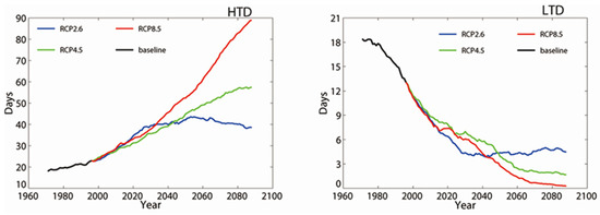 Figure 8 shows that there is an opposite tendency between the projected HTD and LTD nationally under each of the RCP scenarios based on the present-day thresholds. Under the RCP2.6 scenario, the HTD shows a slight increasing tendency in the baseline period, and in the projected periods, it would increase quickly at first and then decrease slightly, while under the RCP4.5 scenario, it would increase a little slower than in RCP2.6 at first and keep on increasing until reaching stabilization by the end of the 21st century, and it would maintain a rapid increasing tendency under the RCP8.5 scenario. By the end of the 21st century, the national mean HTD would increase by 106%, 196% and 346% over the baseline level under the RCP2.6, RCP4.5 and RCP8.5 scenarios, respectively. The national annual mean LTD has shown a decreasing trend in the baseline period, and in the projected periods, there are consistent tendencies of decreasing before the mid-21st century, and the LTD continues to decrease until there are few cold days based on the present–day threshold under the RCP8.5 scenario. However, it keeps on decreasing until stabilizing at approximately 2 days per year under the RCP4.5 scenario, and it would begin to recover in the latter part of the 21st century under the RCP2.6 scenario, which means that there might be a possibility of extreme cold events in the future. By the end of the 21st century, the LTD would decrease by 75%, 90% and 98% under the RCP2.6, RCP4.5 and RCP8.5 scenario, respectively. The analysis above may suggest that the frequency of the warm extremes would become much greater, while the cold extremes would become much more infrequent than the present-day level.