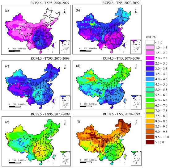 Changes of the TX95 and TN5 by the end of the 21st century compared to baseline level under RCP2.6, RCP4.5 and RCP8.5 scenario: (a) changes in TX95 under RCP2.6 scenario; (b) changes in TN5 under RCP2.6 scenario; (c) changes in TX95 under RCP4.5 scenario; (d) changes in TN5 under RCP4.5 scenario; (e) changes in TX95 under RCP8.5 scenario; and (f) changes in TN5 under RCP8.5 scenario. Unit: °C.