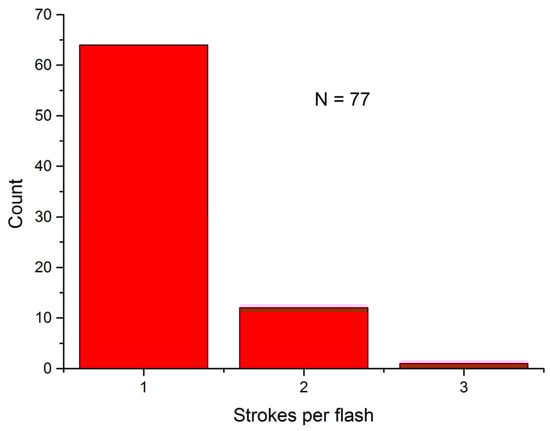 One of the return stroke electric field waveforms of two return strokes, marked RS1 and RS2, preceded by preliminary breakdown (PB) recorded in Indonesia is shown in Figure 2. Table 2 provides a comparison with other research studies at different locations with variations in latitude. This study revealed that the percentage of single, double, and triple strokes of lightning flashes in Indonesia was 83% (64 cases), 16% (12 cases), and 1% (1 case), respectively. The distribution of the number of strokes per flash in Indonesia is displayed in Figure 3. In this study, the average number of strokes per flash was 1.18. The AM values reported by Fleenor et al. [18], Saba et al. [3], Nag et al. [4], Qie et al. [5], and Baharuddin et al. [19] were 1.04, 1.2, 1.2, 1.06, and 1.5, respectively. All observation results showed that the AM values of stroke per flash for different locations are almost identical to each other.