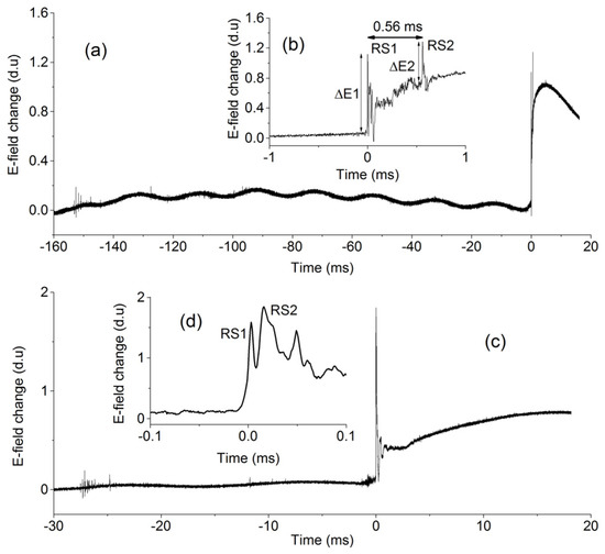 Typical double electric field waveform (a,b); expanded positive CG electric field waveform with very short time interval (c,d).