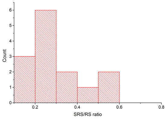 The most important parameter of electric field radiation is return stroke amplitude. Generally, the first return stroke electric field peak is a factor of 2–3 larger compared to that of the subsequent return stroke [11,19]. The summary of the electric field peak ratios of subsequent return stroke to first return stroke (SRS/RS) are displayed in Table 5. In this study, 14 subsequent return stroke electric fields were analyzed. Our AM, GM, and SD values of the electric field amplitude ratio obtained were 0.29, 0.26, and 0.13, respectively. Meanwhile, the minimum, median, and maximum values of the electric field amplitude ratio were 0.11, 0.25, and 0.53, respectively. Figure 6 shows the distribution of the electric field amplitude ratios. We did not find that subsequent return strokes were larger than the first return strokes. This has also been reported in a previous study by Baharudin et al. [19], where, in Sweden, they found AM, SD, GM, minimum, median, and maximum values of 0.48, 0.36, 0.36, 0.05, 0.52, and 3.7, respectively. The subsequent to first return stroke amplitude ratio distribution is shown in Figure 6. Compared with the values reported by Baharudin et al., our AM and GM values were smaller. Further, our minimum and maximum values were in the range as reported by Baharudin et al. In addition, a previous study of negative CG flashes reported by Hazmi et al. [20], conducted at the same location, found AM, SD, GM, minimum, and maximum values of 0.36, 0.27, 0.3, 0.05, and 2.97, respectively. It was found that 2% of subsequent return strokes were larger than the first return strokes in the negative CG flashes. Compared with the values reported by Hazmi et al., our AM and GM values were quite similar. Thus, these observation results were found to be in good agreement with the previous study. The differences may be due to limited data and different thunderstorm types between the two locations.