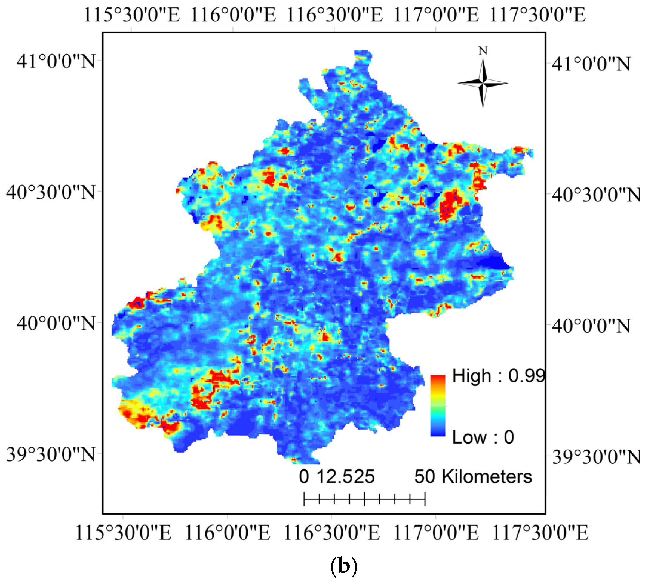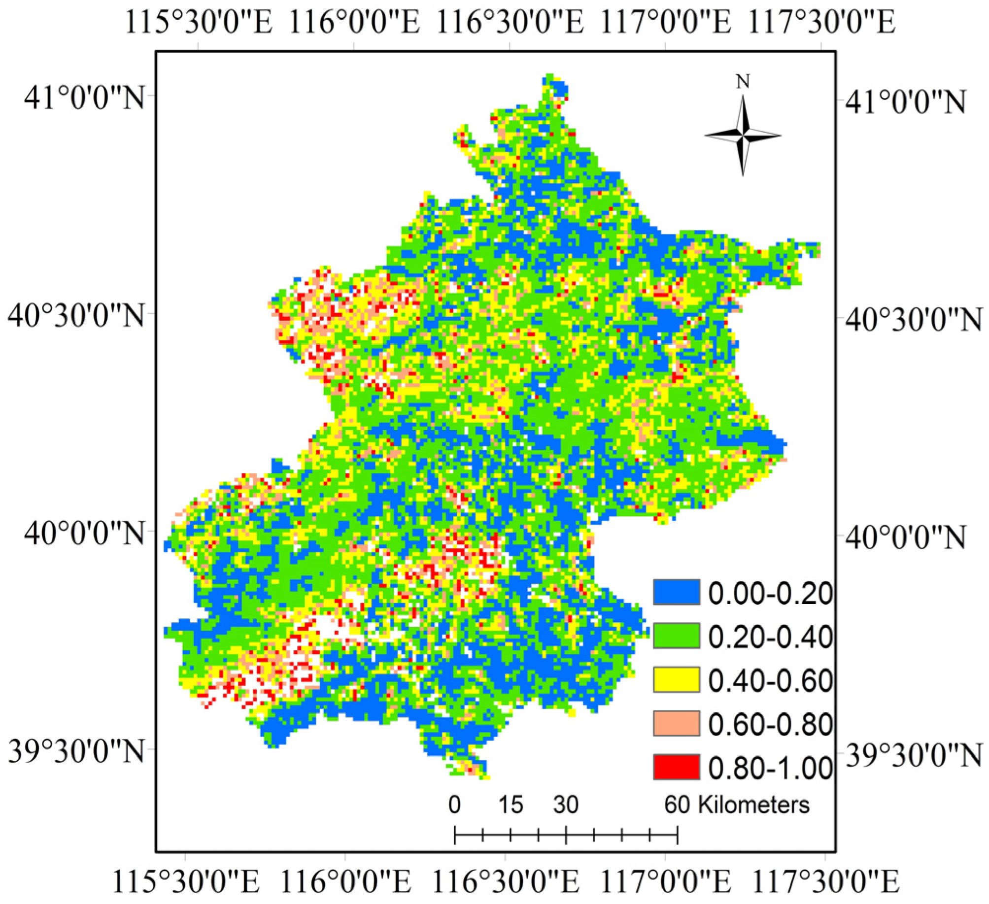 Finally, the aerosol optical thickness inversion spatial distribution of the Beijing–Tianjin–Hebei region was obtained and is shown in Figure 9. There are still a lot of effective data even though many pixels are missing due to cloud. In Figure 9a, the image has four obvious “dividing lines” because the image used for inversion is from two merged original MODIS images. Among the stitching image, two or three rows of data are nonexistent and seen as the first dividing line. After a process of structure function value calculation, there are two further dividing lines. During the comparison of two structure function values, four dividing lines are formed.