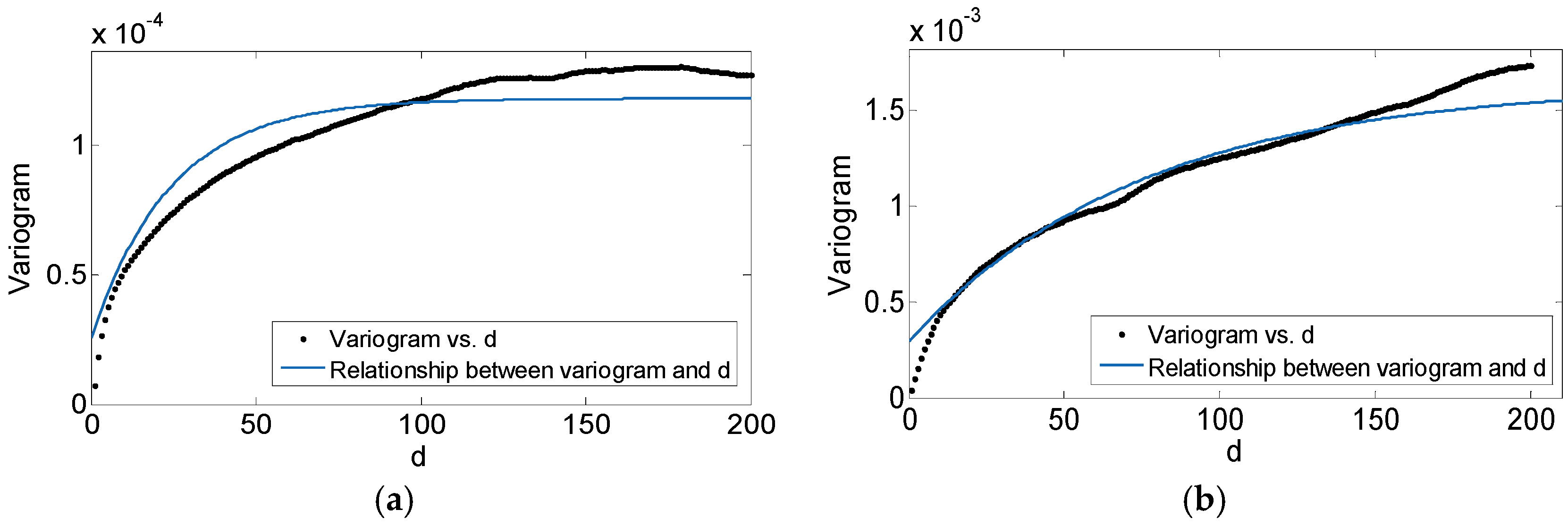 Relationship between the variogram and d. (a) The acquisition date of the MODIS image is 10 February 2015. (b) The acquisition date of the MODIS image is 14 February 2015. The black dots are actual calculated variogram values and the blue solid lines are the curve fittings.