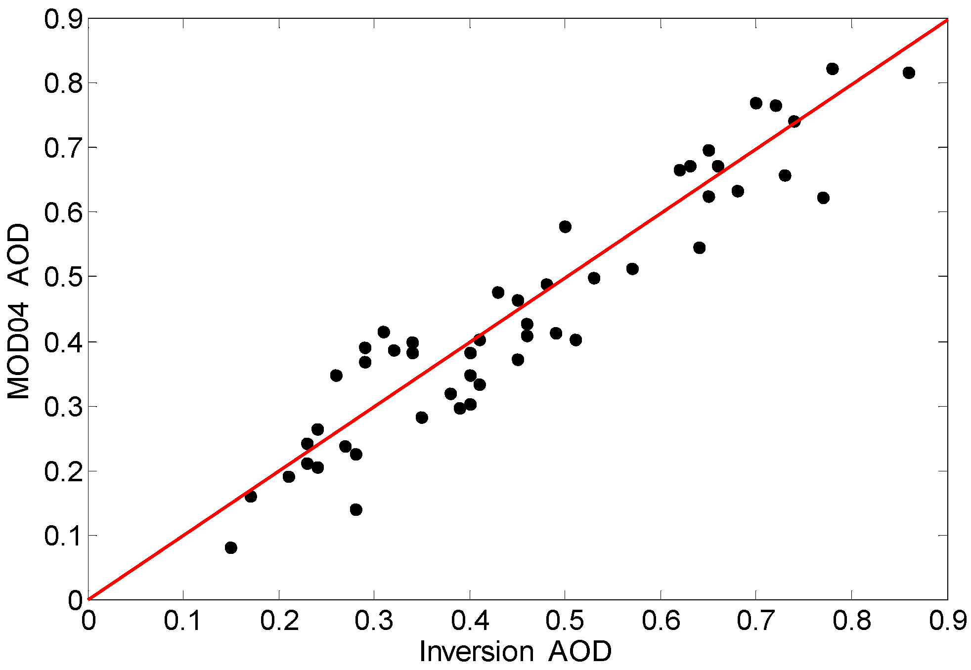 Comparison between inversion AOD and MOD 04 AOD. The black dots represent 50 sets geographical location, and the red solid line represents y = x.