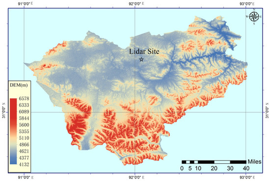 Lidar observations in summer of 2014 as a part of the TIPEX III were performed at the Nagqu Meteorological Bureau (31.48° N, 92.06° E, 4508 m m.s.l.) on the Tibetan Plateau. The location of the Nagqu site and the topography of the Tibetan Plateau are shown in Figure 1. Nagqu is located in the central part of the Tibetan Plateau. The elevated surface heat and the rising air over the plateau lead to anticyclonic circulation and divergence in the upper troposphere and lower stratosphere [16].