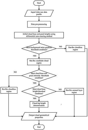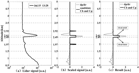 The methods of CBH retrieval using lidar data mainly include the threshold method [20] and differential zero-crossing method [21]. In threshold method, the CBH is defined as the level where there is firstly an increase in signal above the clear background level and of a magnitude equal to N times the standard deviation of the background fluctuations Furthermore, it is required that the signal should be increased continuously for at least M successive height intervals. Thus, it has a relative complex adjustment process since the threshold value M and N need to be adjusted repeatedly based on the properties of cloud and aerosol so that it is hard to realize the automatic processing. The differential zero-crossing method judges the point where the value of the first derivative of the lidar backscatter power changes from negative to positive as the CBH, but there may exist misjudgment when the Signal Noise Ratio (SNR) is lower or the fluctuation of noise is too large. In this section, the improved differential zero-crossing method is used [22], and it is based on differential zero-crossing method, and additionally three threshold conditions are also used to effectively avoid misdiagnoses. Figure 3 shows the flow chart of cloud properties retrieval based on improved differential zero-crossing method. The raw lidar data need pre-processing including the noise removal and temporal-spatial average to improve their SNR. In order to decrease the cloud layer misdiagnoses due to the aerosol layer and background noise, three threshold conditions are carried out in this algorithm. Firstly, the background noise gradient threshold is calculated. Specifically, the mean value K and the standard deviation e of the background noise first derivative are calculated, and the candidate cloud region should meet the condition of , where is the lidar signal after data pre-processing, and n is a positive value with fine tuning in different atmospheric conditions, otherwise, the analyzed area is regarded as cloudless area. Secondly, the threshold of cloud base and peak intensity should be calculated. Specifically, the mean value M of the background noise is calculated, and the candidate cloud region should be satisfied that the lidar signal intensity difference between the cloud peak and cloud base is larger than , that is, , and a is a positive value with fine tuning in different atmospheric conditions, the tuning standard of which has been listed in Table 3. Otherwise, the analyzed area is regarded as cloudless area. Thirdly, the threshold of CBH is determined based on the ground-based observations that the averaged low CBH is about 512 ± 148 m with the lidar overlap into consideration. Thus, the layer below 500 m above ground level (AGL) is eliminated [23]. Figure 4 shows the case study using improved differential zero-crossing method [22]. The left diagram is lidar signal, the middle diagram is the first derivative of the lidar signal (dashed line) with candidate cloud layer (solid line value equals to 1). Since the amplitude difference of the first derivative of lidar signal induced by cloud, aerosol and background noise is significant in most cases, the final cloud layers shown in the right diagram are selected using three threshold conditions mentioned above. After the determination of CBH, the cloud top height is determined where the lidar signal is less than the cloud base’s and . When the cloud is optical thick and impenetrable, the point with a minimum value above the cloud peak height in the candidate area is regarded as the cloud top height. It is noted that comparison and combination in adjacent cloud layers should be done when the cloud has complex structure.