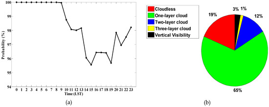 CL31 (a) Data acquirability; and (b) the probability distribution of cloudless (red), one-layer cloud (green), two-layer cloud (blue), three-layer cloud (yellow) and vertical visibility (black) during the experiment period.
