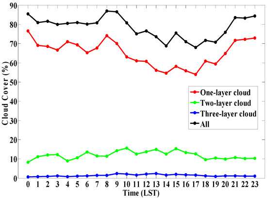 The cloud occurrence of CL31 is defined as the ratio of the cloudy profiles and the total profiles. The occurrence frequency of a specific layer cloud (e.g., one-layer cloud) at specific time interval is defined as ratio of the profiles having the specific layer cloud and the total profiles. It can be seen in Figure 6 that the averaged cloud occurrence is between 70% and 90% each day, which is consistent with the results from millimeter-wave radar and satellite data [13,28]. It can be also seen that the diurnal variation of cloud occurrence is obvious, that is, the cloud occurrence has a minimum value between 13:00 and 14:00 LST, and with the enhancement of the surface radiation, the atmospheric activities become more convective with cloud occurrence rapidly increasing. Moreover, the occurrence frequency of multilayer cloud is relative low and stable, on the other hand, the one-layer cloud occurrence frequency has an obvious variation with a maximum proportion.