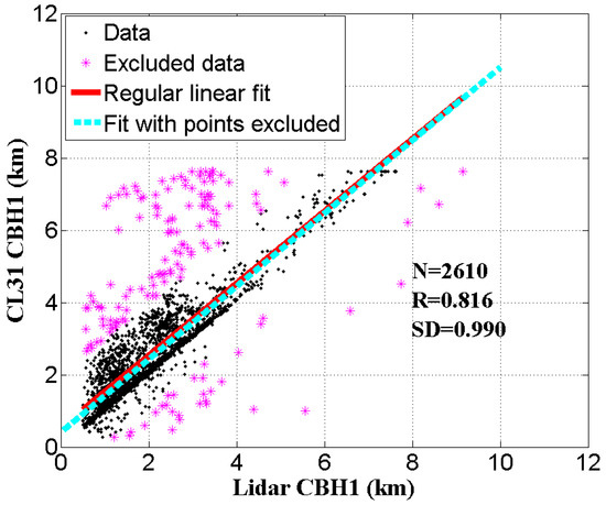 The comparison of first CBH (CBH1) between CL31 and WACAL has been analyzed in Figure 7. Noted that CL31 has the ability of 24-h continuous observation while the WACAL is only operated at about 09:00–12:00, 14:00–19:00, and 20:00–23:00 each day except for the passes of CALIPSO, the matching time should be based on the WACAL sampling time. Thus, the data every 4 min are chosen to compose the dataset with the number of 2610. In Figure 7, the red solid line and light blue dashed line represent the linear fit for all dataset and the data excluding , respectively, where fdata is the fitted value, ydata is the corresponding CL31 CBH, and SD represents the standard deviation of ydata. The black dashed line is the weighted least square fit for all dataset. The black and pink dots represent within and without the standard deviation of ydata. The occurrence of the pink dots is mainly the result of different cloud layer comparison for these two devices. Non-strict time comparison may result in deviation in this process; moreover, when it occurs due to low thin cloud, CL31 sometimes has fault decision by mistake, resulting in different cloud layer comparison for these two devices. Basically, the CBH of CL31 and WACAL shows a good consistency with the correlation of 0.82 and standard deviation of 0.99 km. After excluding the singular value in pink dots, the correlation and standard deviation has been increased up to 0.92 and decreased to 0.64 km, respectively.
