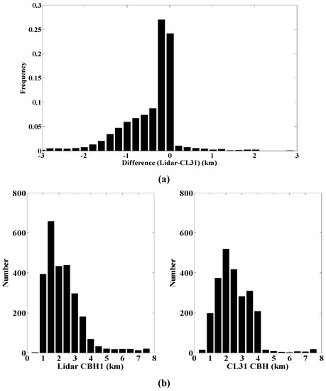 (a) CBH1 difference between WACAL; and (b) distribution of the CBH1 of WACAL (left) and CL31 (right) during the measurement period.